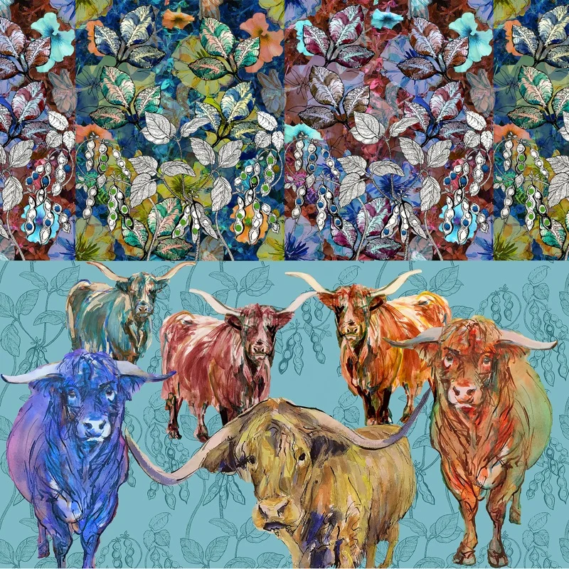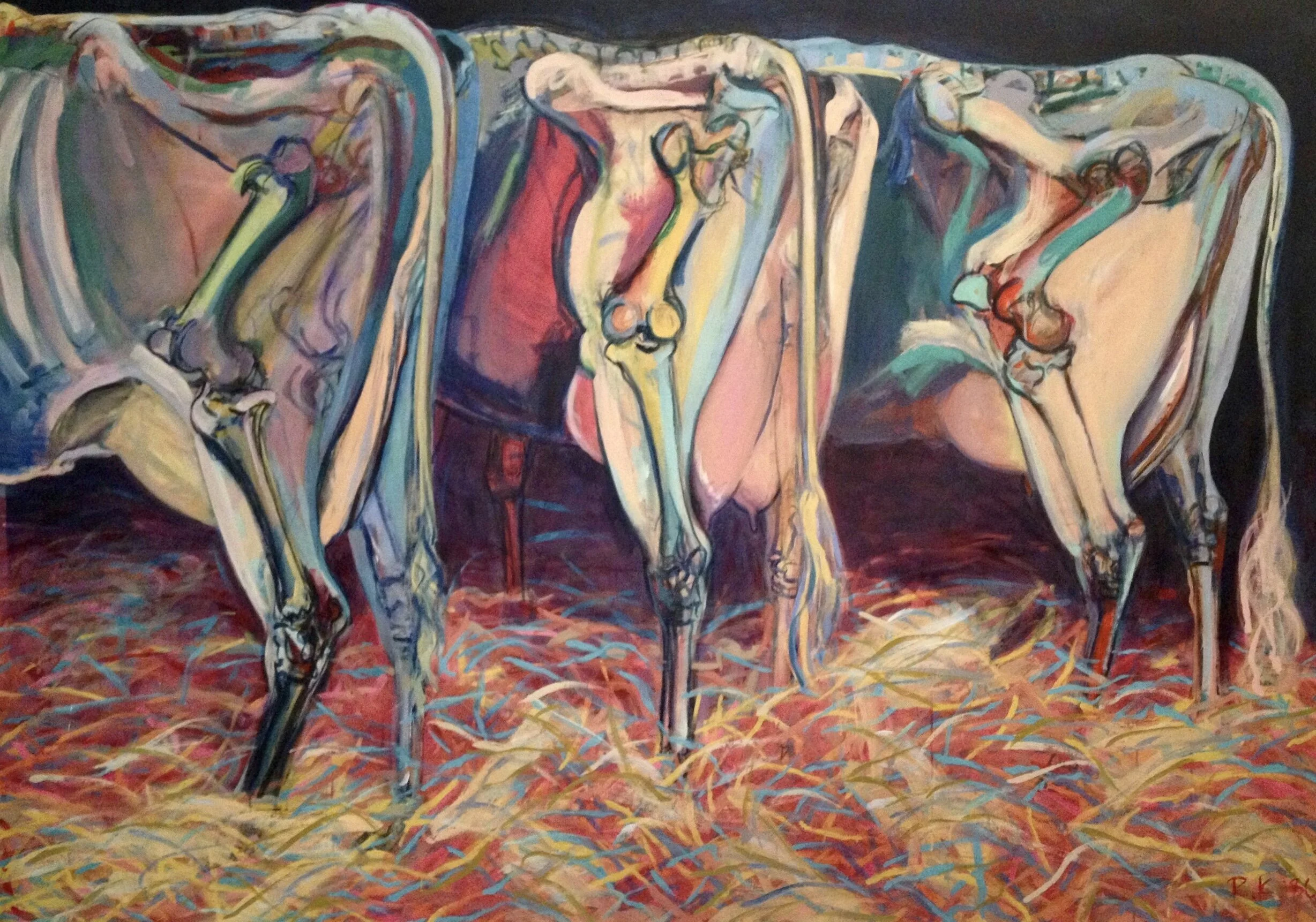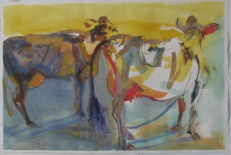 I have long been interested in the subject of the Cow, as icon, in my paintings and in this watercolor series, I am exploring a tableau of cows in motion from an emotional perspective.
